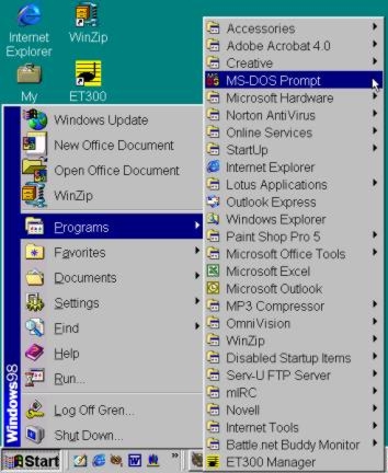 Locate the DOS Prompt on your PC: Click Start>Programs>MS-DOS Prompt.
