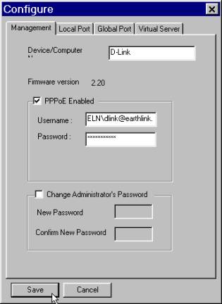 Input your computer name at the Device/Computer box. Check the PPPoE Enabled box. Enter ELN\ and then your username provided by your ISP at the Username box. >ELN\ must all be in capital letters entered before your username. Enter your password provided by your ISP and click Save.